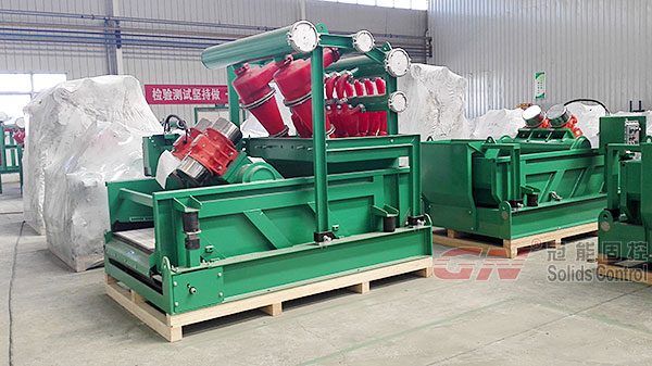 3 臺GNZS594J-2S12N泥漿清潔器。 冠能的除砂除泥一體機是由兩個十英寸的除砂旋流器、十二個四英寸的除泥旋流器和一臺GNZS594底流篩組成。這款泥漿清潔器的工作性能比不配備底流篩的單獨除砂器、除泥器處理效果好。