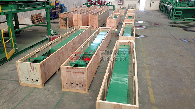 2、配備12臺螺旋輸送器,用于振動篩,泥漿清潔器、離心機等固控設備處理后排出的鉆屑,并提供給鉆屑甩干機。冠能公司生產的螺旋推料器U型槽增加了框架支撐,電機和齒輪箱也有鋼框架的保護。螺旋材料采用16Mn,具有更好的耐磨性,螺旋設計12英尺為一節,方便現場安裝及運輸。