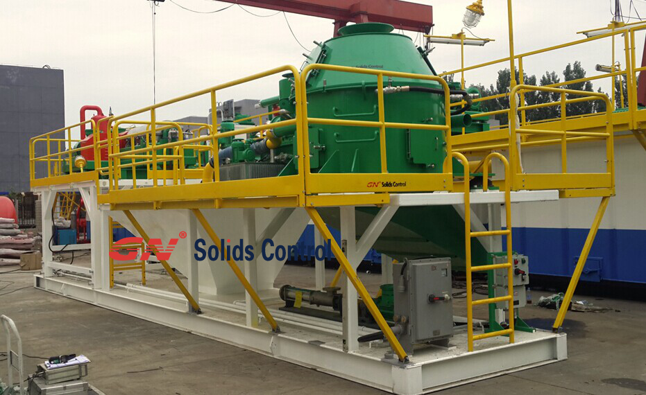 冠能150GPM泥漿系統配置如下 1、1臺GNZS703D雙層振動篩上安裝了3個4寸除泥旋流器,通過GNZS703D雙層篩可以把粗砂除去,然后通過除泥旋流器把20um左右以上的顆粒在分離除去, 2、2臺GNSB4X3-12J的砂泵安裝在泥漿罐斜倉上,1臺用于給除泥器供漿,另外1臺作為混漿泵使用。 3、4米長的泥漿罐,非常緊湊的設計跟合理的布局,對于狹小的鉆井空間非常適宜。